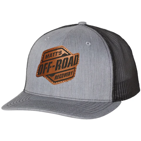 Gear up with the perfect blend of rugged style and off-road spirit. This Matt's Off-Road Recovery Leather Patch Hat features a classic mid-profile trucker design with a structured gray front, black mesh back, and a detailed genuine leather patch stamped with the iconic Matt’s Off-Road Recovery badge.